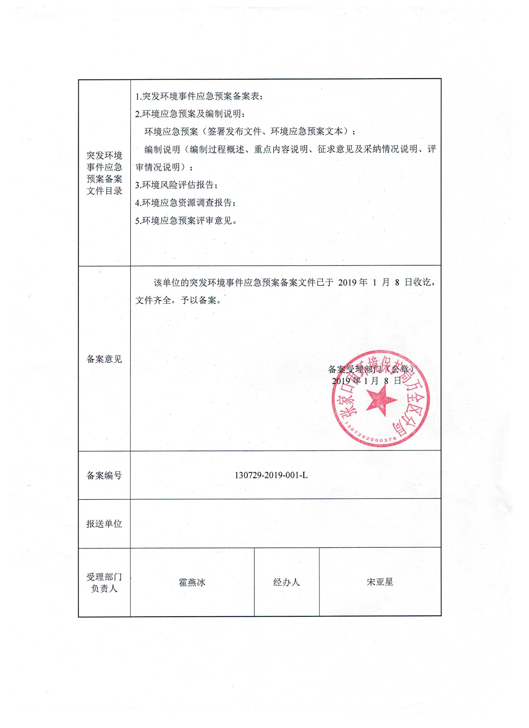 2019年突发环境事件应急预案备案表2